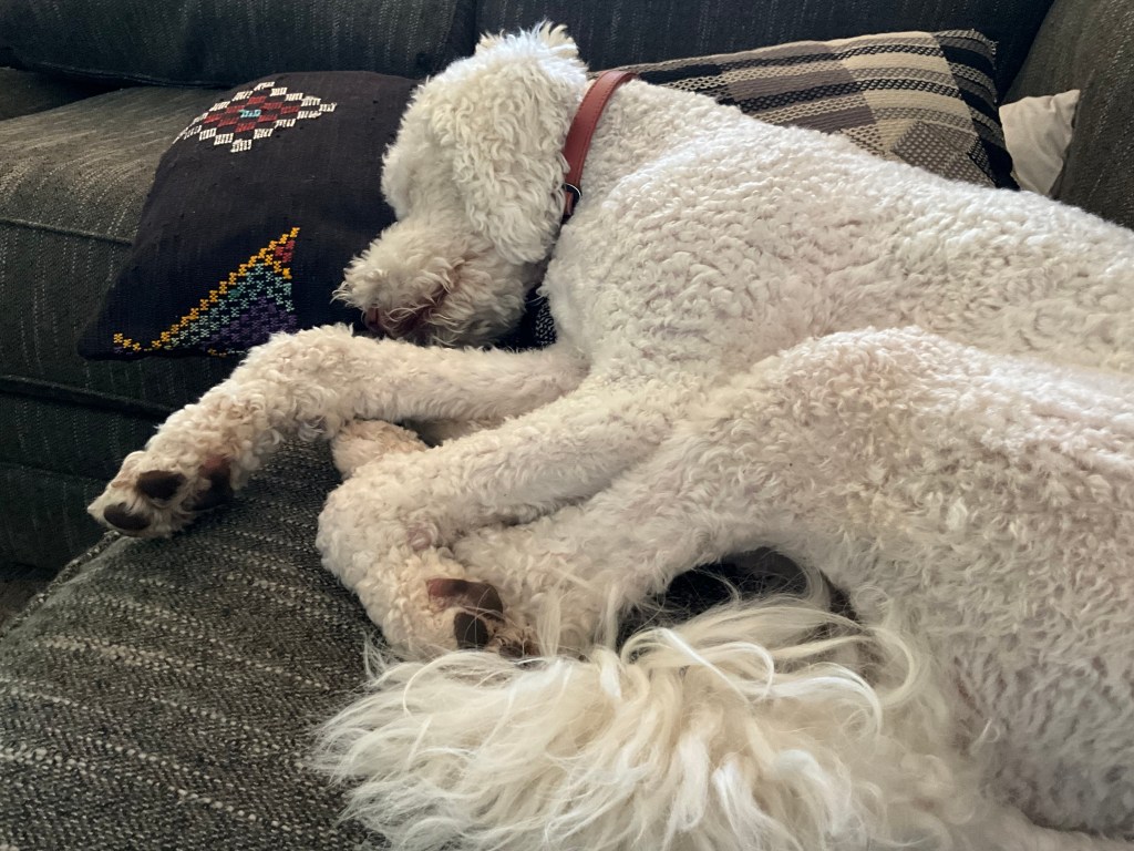 On this Sunday morning after our walk, Andy is taking a snooze while I catch up around the house. It’s still hot, and we finished our walk a little before 8 AM. Absolutely nothing interesting happened today. On Sundays, we take our noisy walk, meaning we walk where there is traffic to keep Andy used to being around cars. He does really well and will mostly walk off-leash unless there are other dogs. As you can see from the picture, though, it does wear him out. He really is the best little guy.